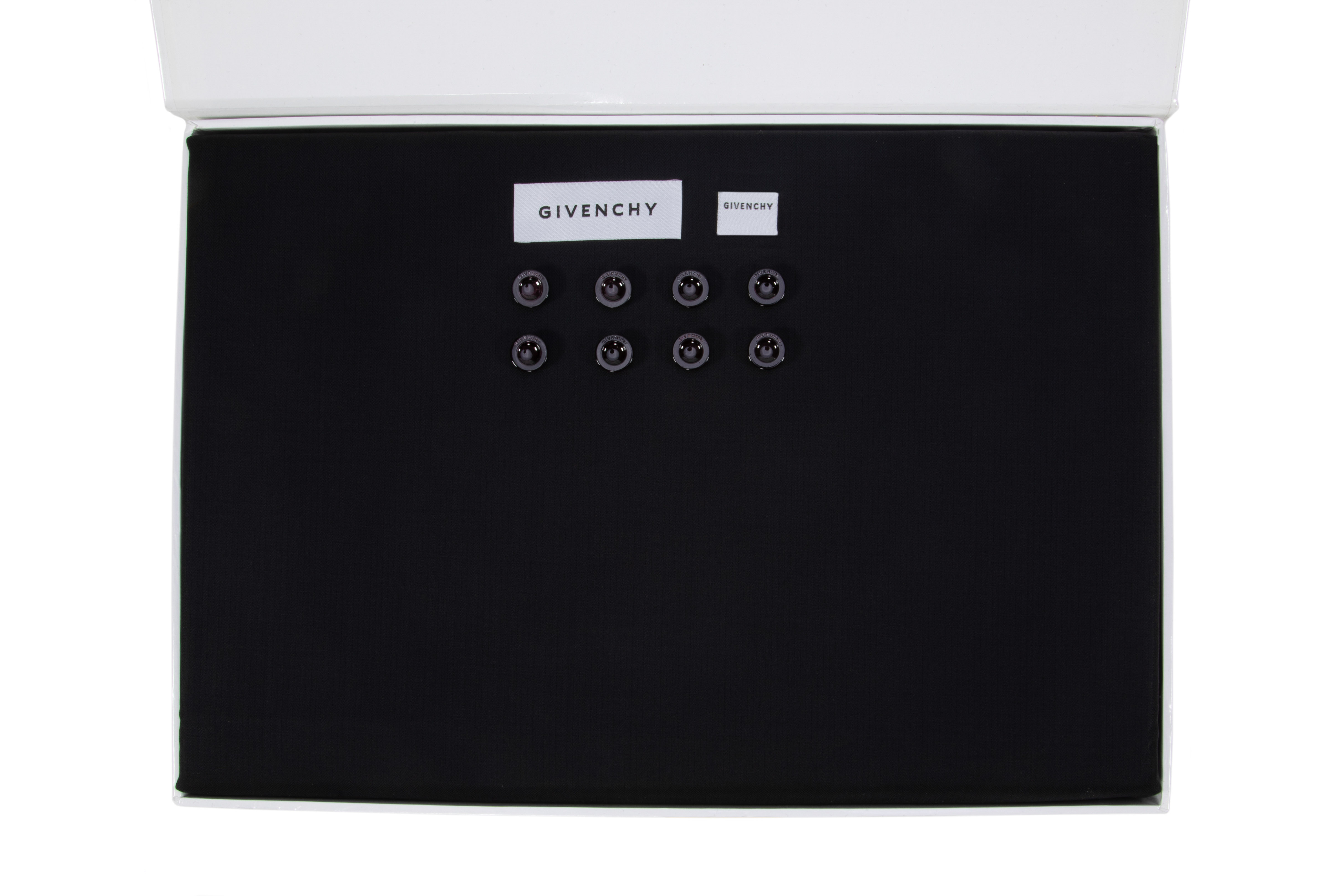 العلبة تحتوي على ثمان أزرار مصنوعة من الصدف الطبيعي والتي يأتي محفوراً عليها شعار ماركة جيفنشي.