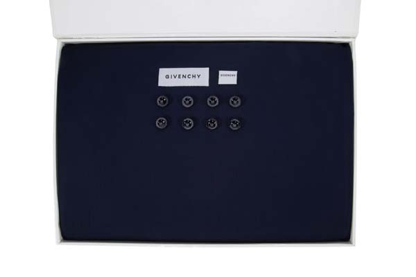 العلبة تحتوي على ثمان أزرار مصنوعة من الصدف الطبيعي والتي يأتي محفوراً عليها شعار ماركة جيفنشي.