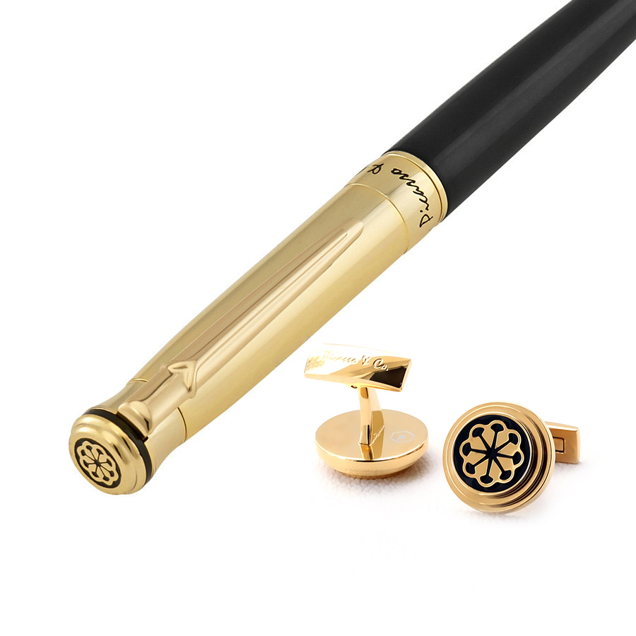 بيكاسو اند كو طقم قلم وكبك نقش متماثل -زهرة الملك السويدية- لون ذهبي واسود كبك: مصنوع من معدن الستيل مقاوم للصدأ مطلي بلون ذهبي مع الياف كربونية سوداء قلم: حبر جاف مطلي باللون الذهبي والاسود طوله مغلق 13.5 سم مع علبة فخمة